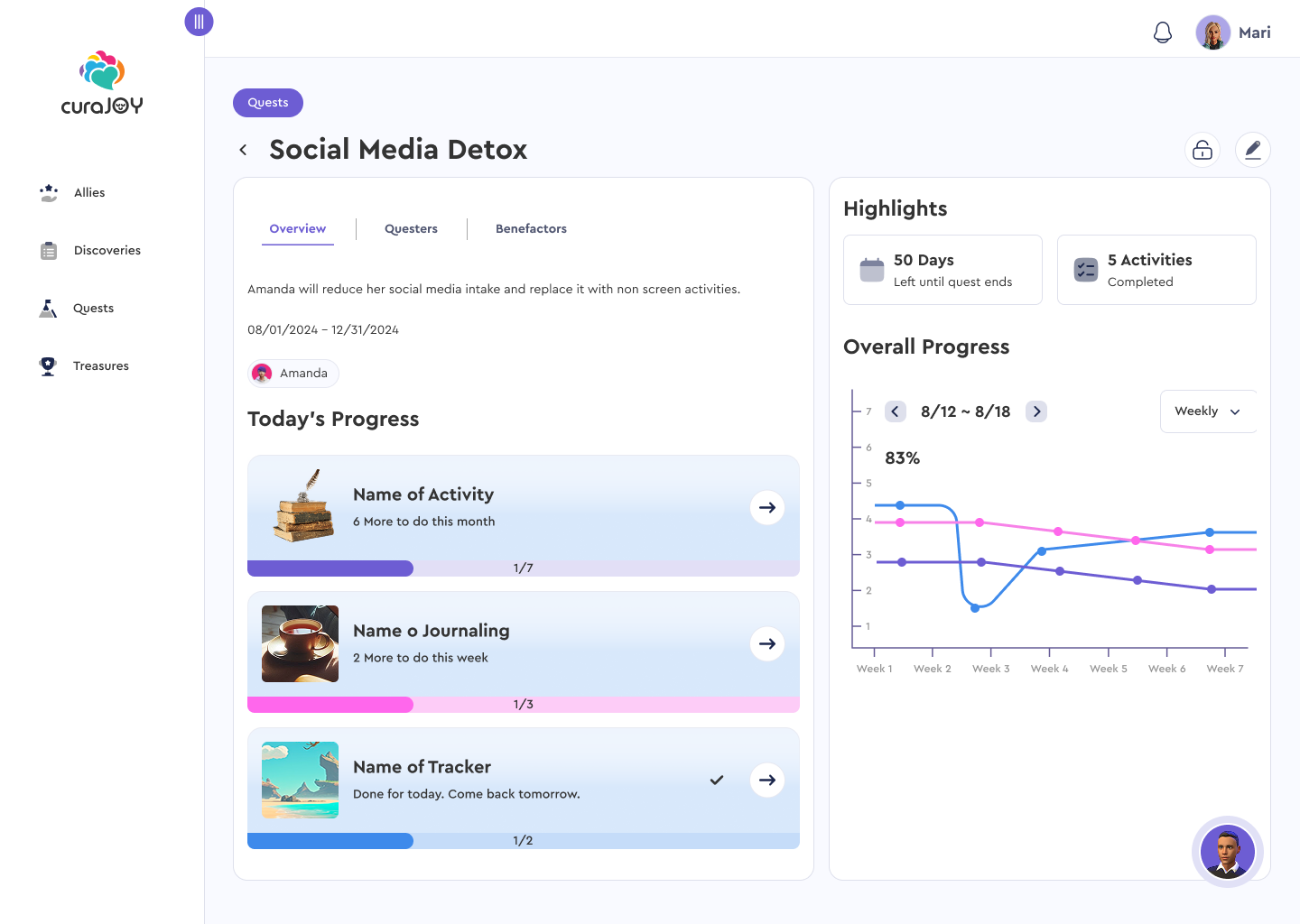 CuraJOY is a nonprofit tech company focused on making mental health support more accessible through gamification and AI-driven tools. I was brought in to design the Quest pages, where users complete activities to build positive habits. While the structure was in place, key design challenges remained—engagement was low, progress tracking lacked clarity, and the experience didn’t fully motivate users. My role was to refine the interface, improve data visualization, and create a more intuitive, visually engaging experience that keeps users motivated to continue their mental wellness journey.
