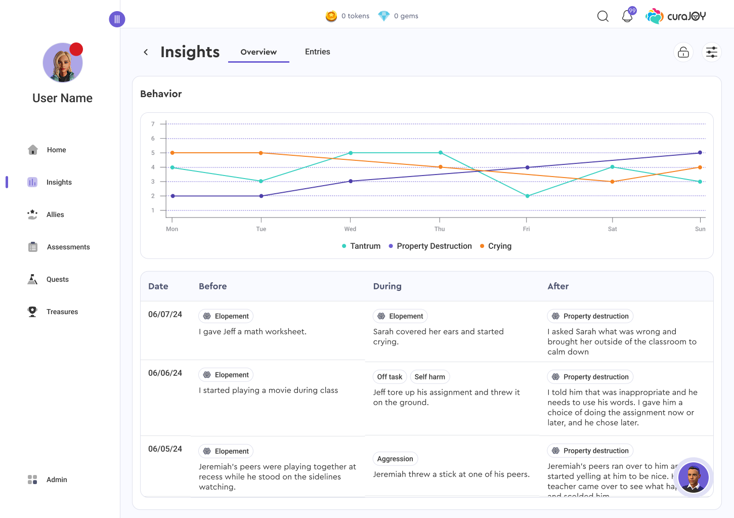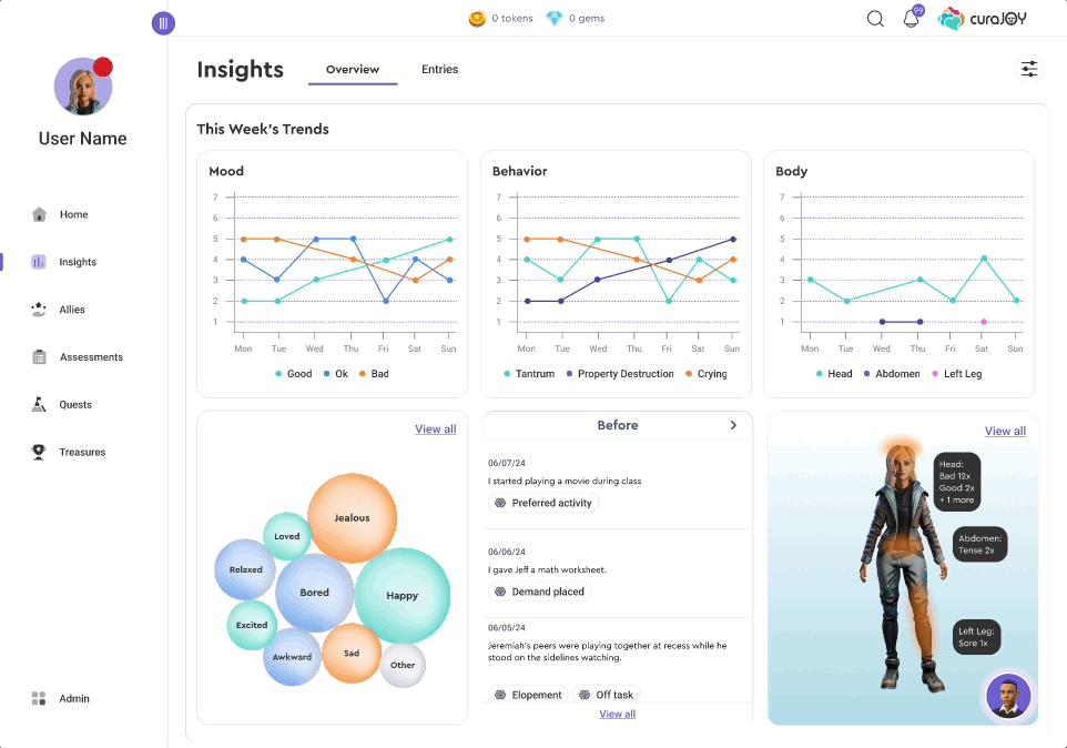 CuraJOY is a nonprofit tech company focused on making mental health support more accessible through gamification and AI-driven tools. The Insights Page is a new feature that brings together user-submitted data (mood, body, and behavior check-ins) into one centralized and visually engaging view.