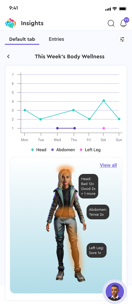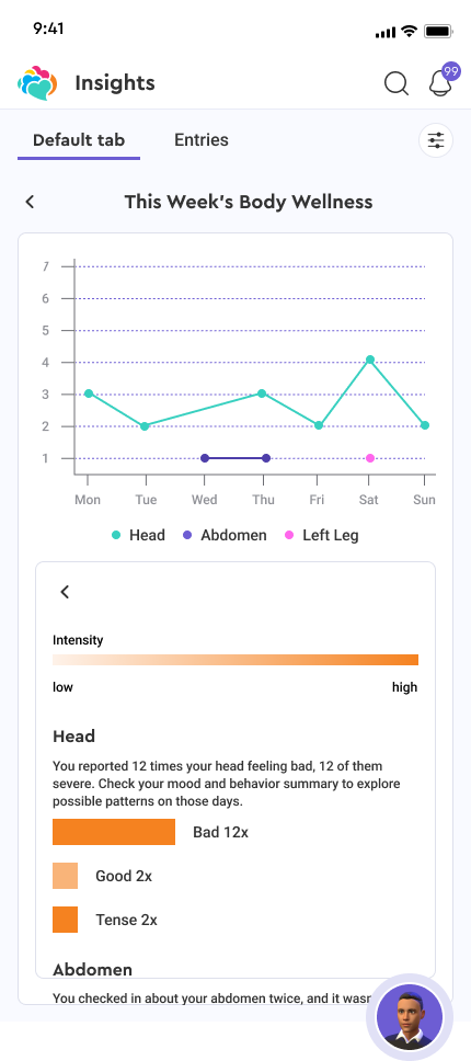 For body-related check-ins, we explored static charts but realized users needed something more spatial. We designed an interactive body map (similar to the way body check-ins are done) where pain levels are color-coded and plotted over time—allowing users (or agents) to spot chronic pain patterns and relate them to mood or behavior.