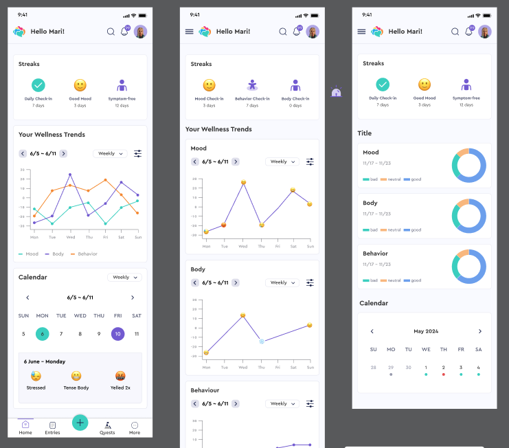 One of the toughest design challenges was figuring out how to visualize mood trends in a way that felt both emotionally resonant and clear. Early iterations included bar charts and line graphs, but they didn’t quite capture the nuance or variety of emotions people reported.