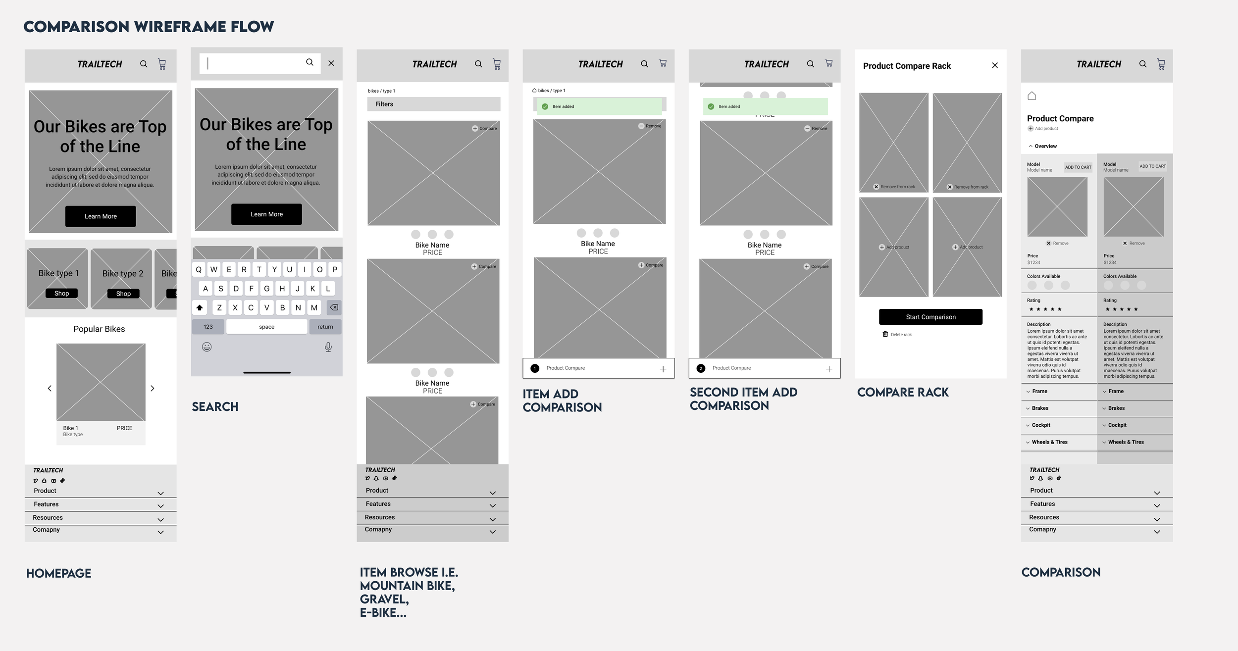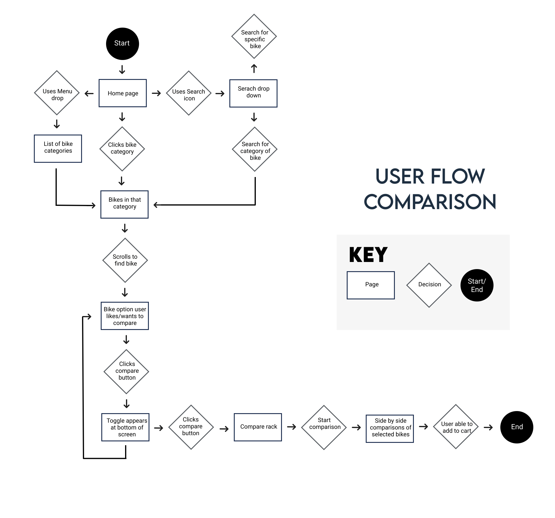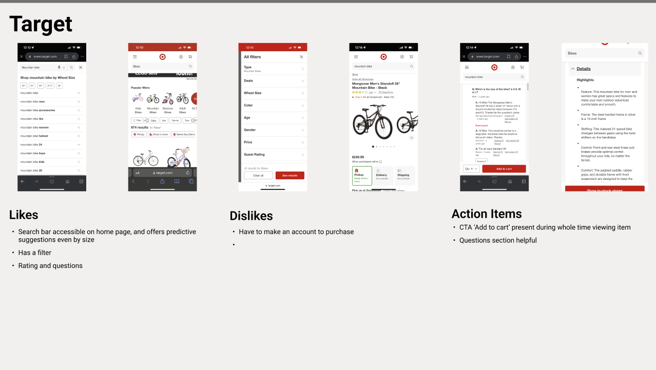 I conducted a competitive analysis using two well-known bike sites and a popular e-commerce site. This led to design goals like comparison tools and highlighted differences between general and specialized sites.